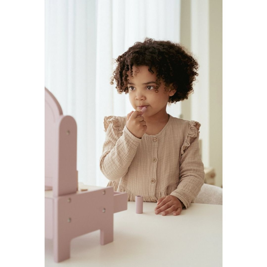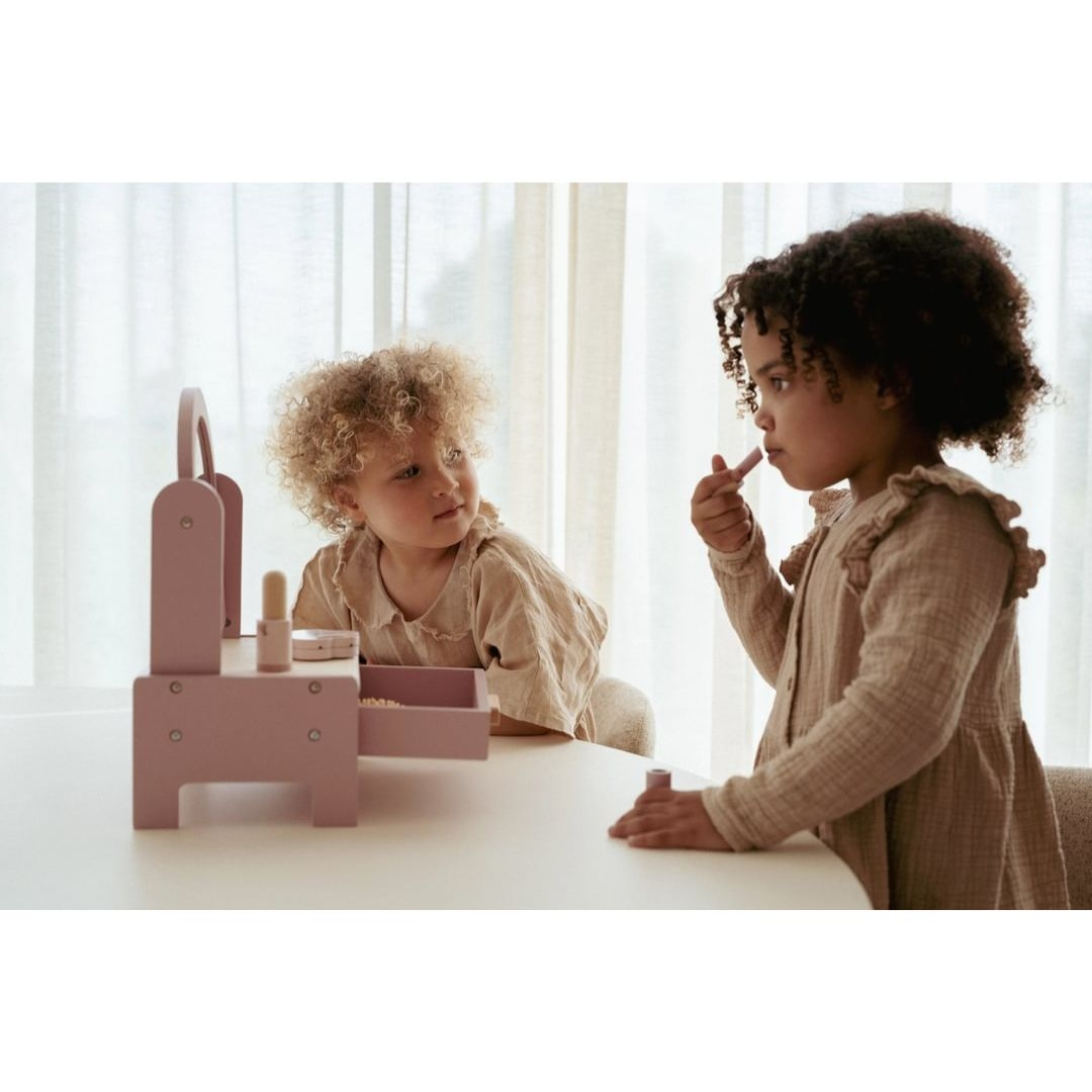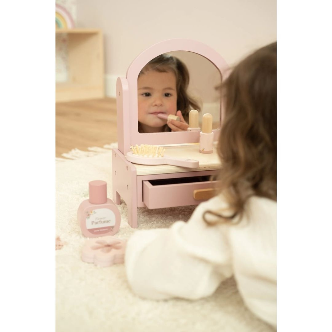 Αυτό το ξύλινο Boudoir της Little Dutch συνοδεύεται από έναν περιστρεφόμενο καθρέφτη και μια σειρά από προϊόντα ομορφιάς, ενώ διαθέτει επίσης ένα συρτάρι αποθήκευσης για κορδέλες και κλιπ μαλλιών(δεν περιλαμβάνονται).