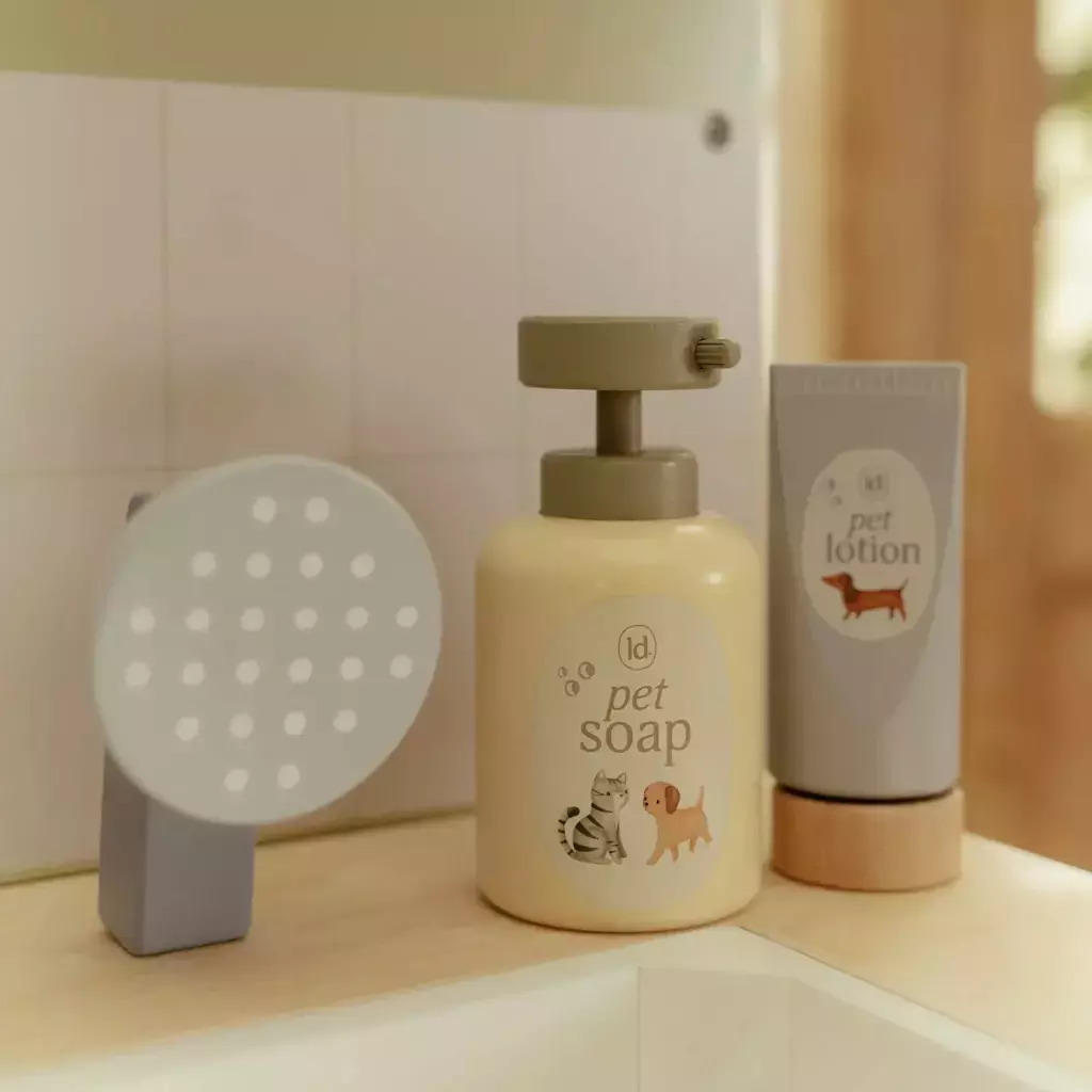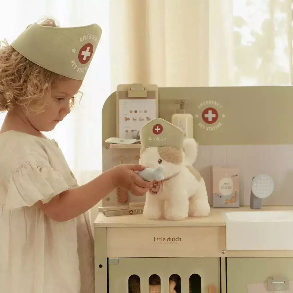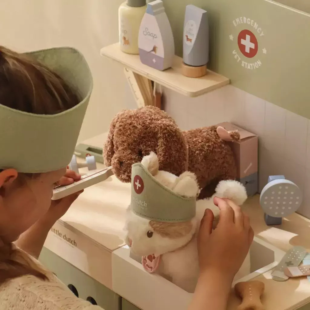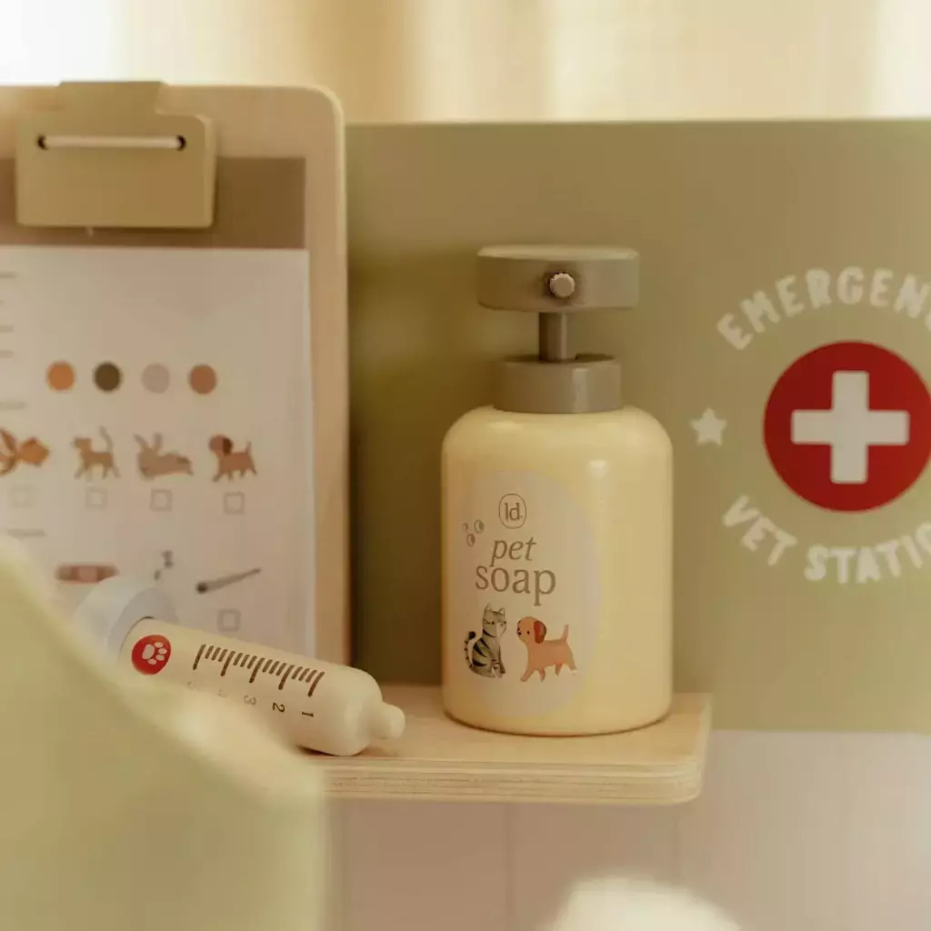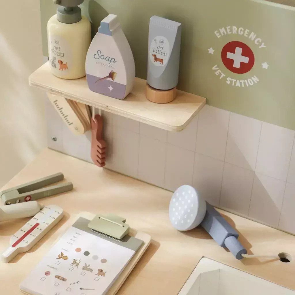 Φροντίζετε καλά τα άρρωστα λούτρινα ζωάκια και τα κατοικίδια; Με αυτό το εκτεταμένο ξύλινο κτηνιατρείο, το μικρό σας μπορεί να βυθιστεί πλήρως στον εαυτό του ως πραγματικός κτηνίατρος. Το σετ περιλαμβάνει όλα όσα χρειάζονται για τη φροντίδα των κατοικίδιων, όπως μια αναδιπλούμενη κεφαλή ντους με νιπτήρα, μια χτένα, ένα θερμόμετρο, μια σύριγγα και τσιρότα. Περιλαμβάνονται επίσης μια υφασμάτινη κορδέλα για το κεφάλι και ένα ειδικό κλιπ για να κρεμάτε ιατρικές εικόνες και ακτινογραφίες. Ώρα για τον επόμενο ασθενή!